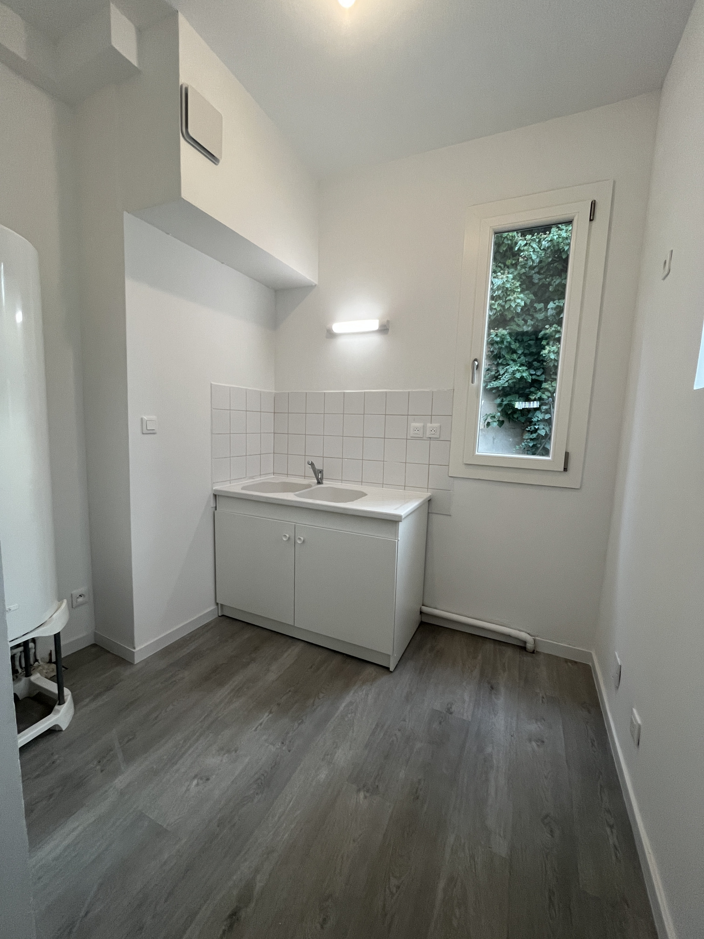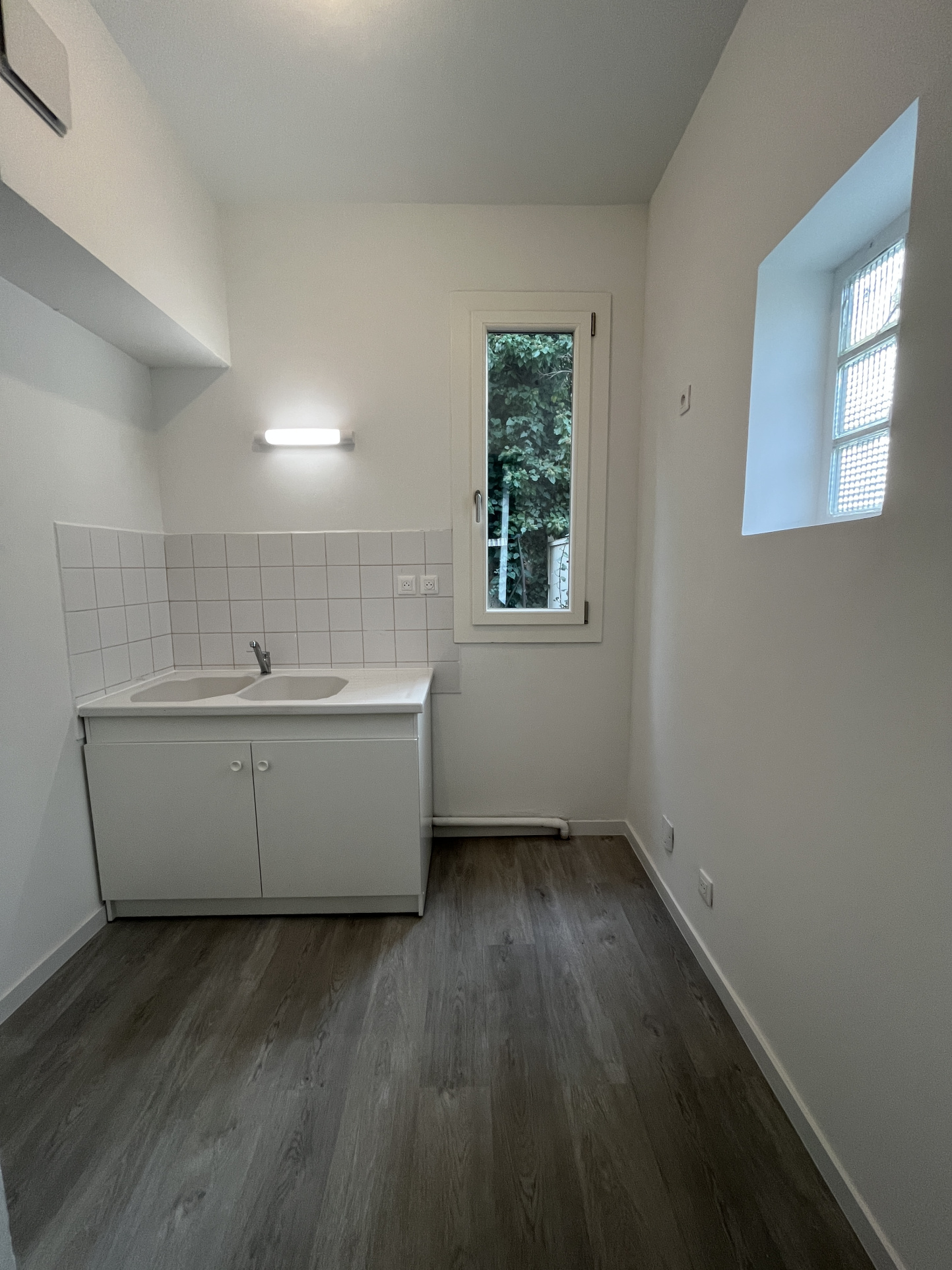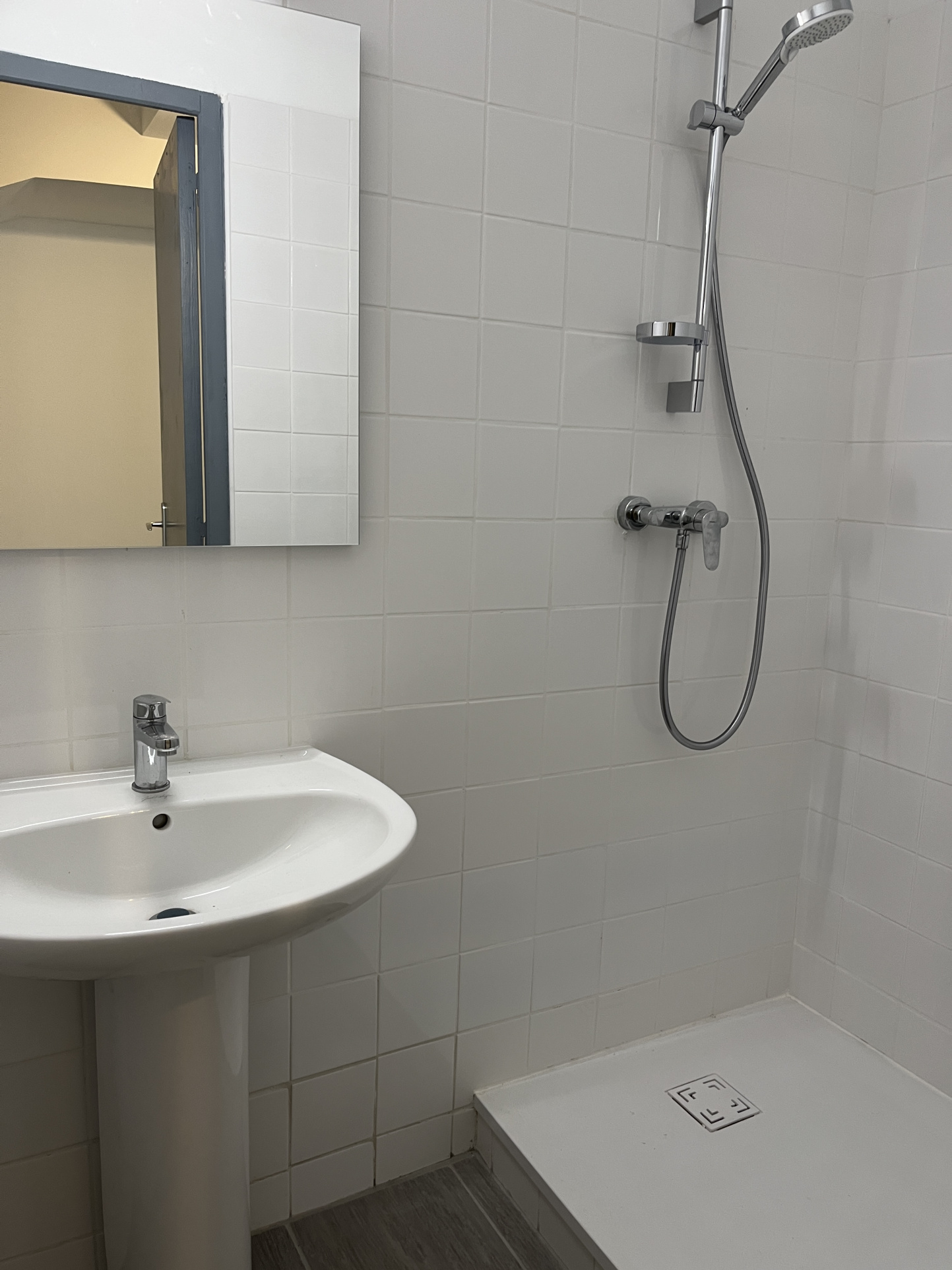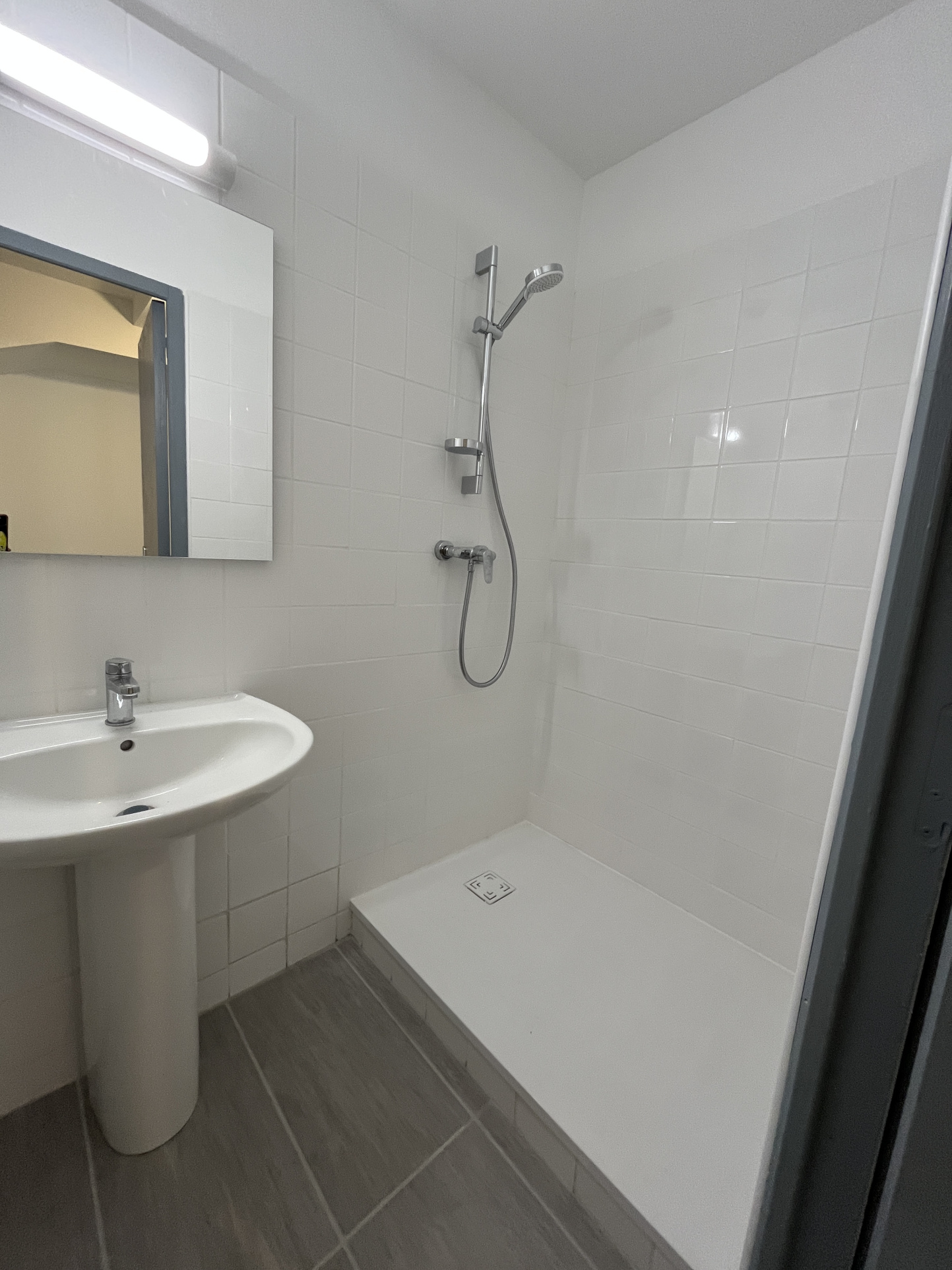 Le bien dispose également d'une salle d'eau contemporaine avec une grande douche et un sèche-serviettes.
