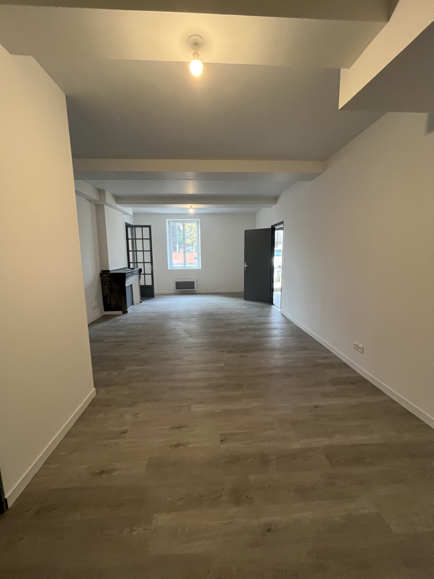 Vous profiterez d'une vaste pièce de vie lumineuse sublimée par de belles poutres apparentes et un sol chaleureux.