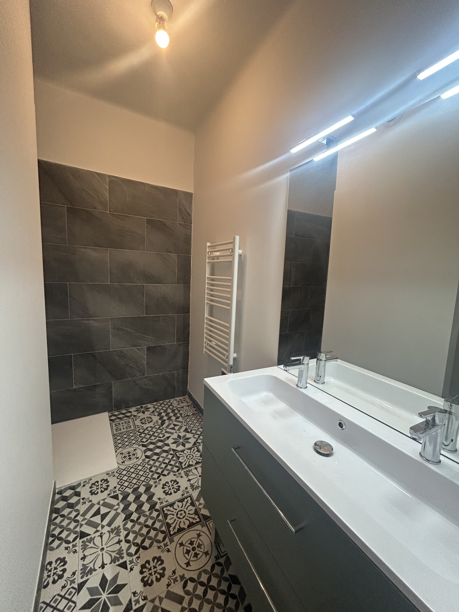 Design : Cuisine ouverte noir mat & bois + douche italienne