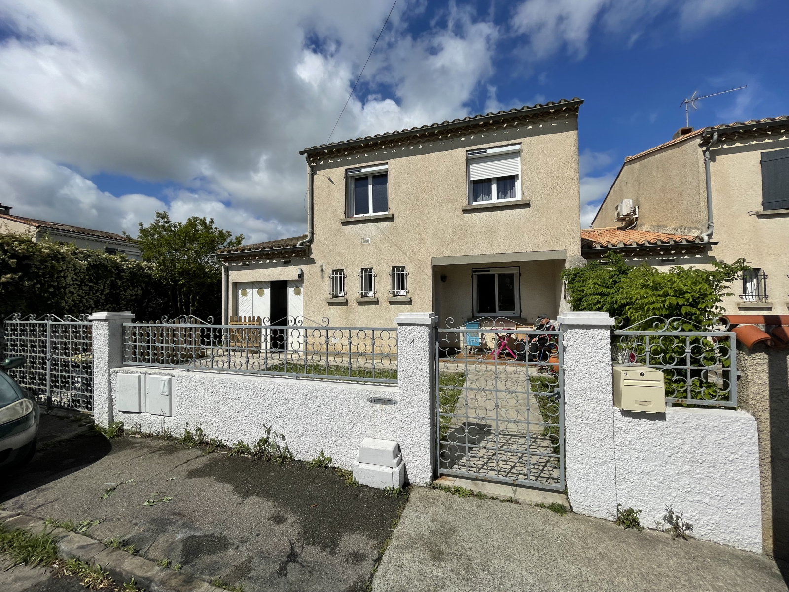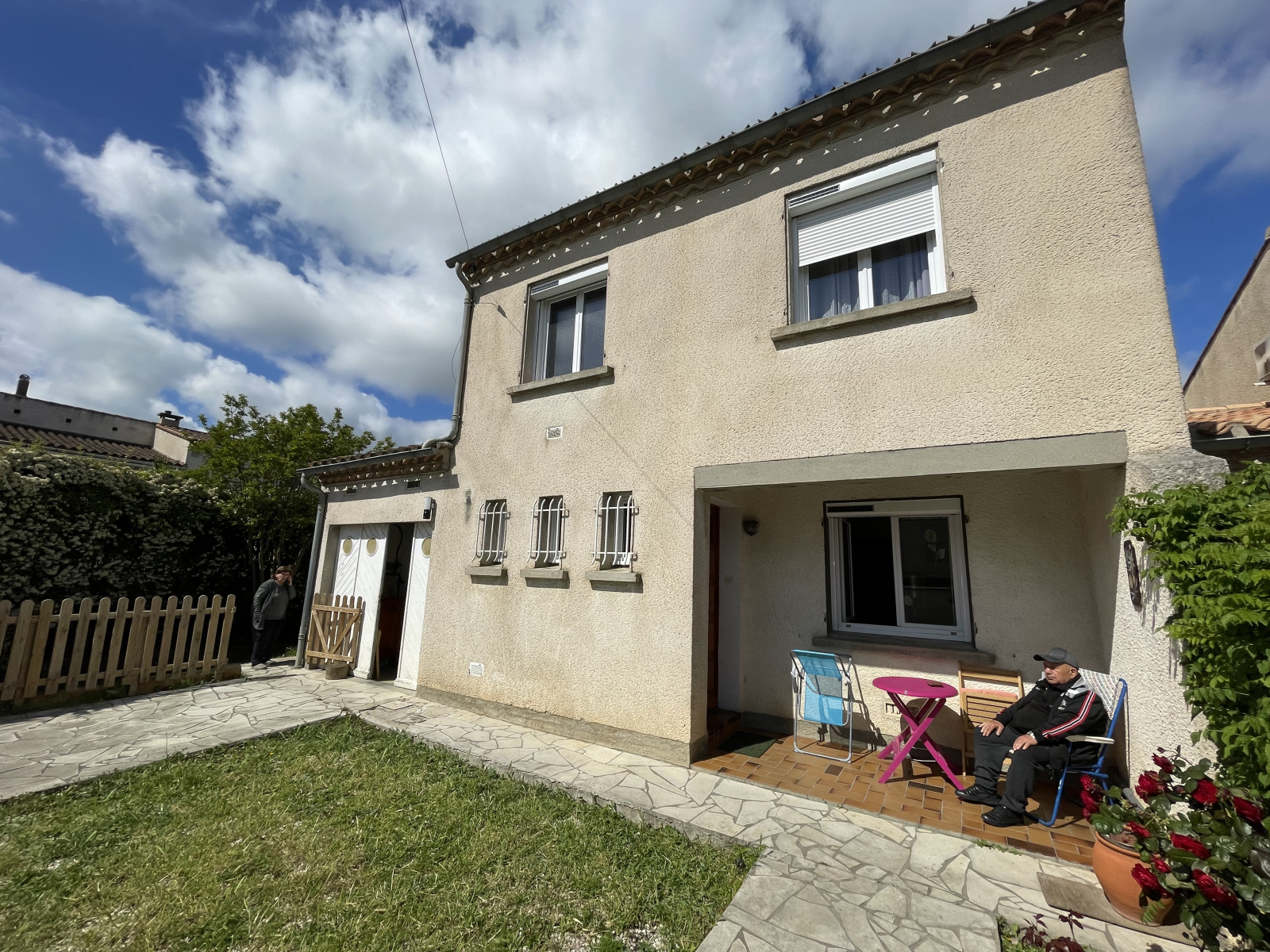 La maison est contruite sur deux niveaux avec un garage attenant.